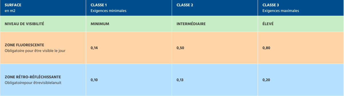 3 classes de protection déterminent la visibilité du vêtement en fonction des surfaces des matières fluorescentes et rétro-réfléchissantes.